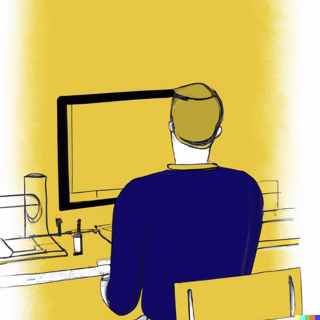 DALL·E prompt: Sketch of cool guy’s back at computer creating plans in mid century modern yellow and navy blue style