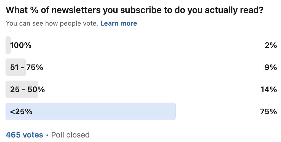 During this three-year journey, I’ve endeavored to deliver more than “just a newsletter,” but I realize we are entering a time of newsletter fatigue. In fact, I ran a couple of polls on LinkedIn earlier this quarter, and I learned that more than 69% subscribe to less than five newsletters (out of 202 votes) and over 75% stated that they actually read less than a quarter of the newsletters they subscribe to (out of 465 votes).
