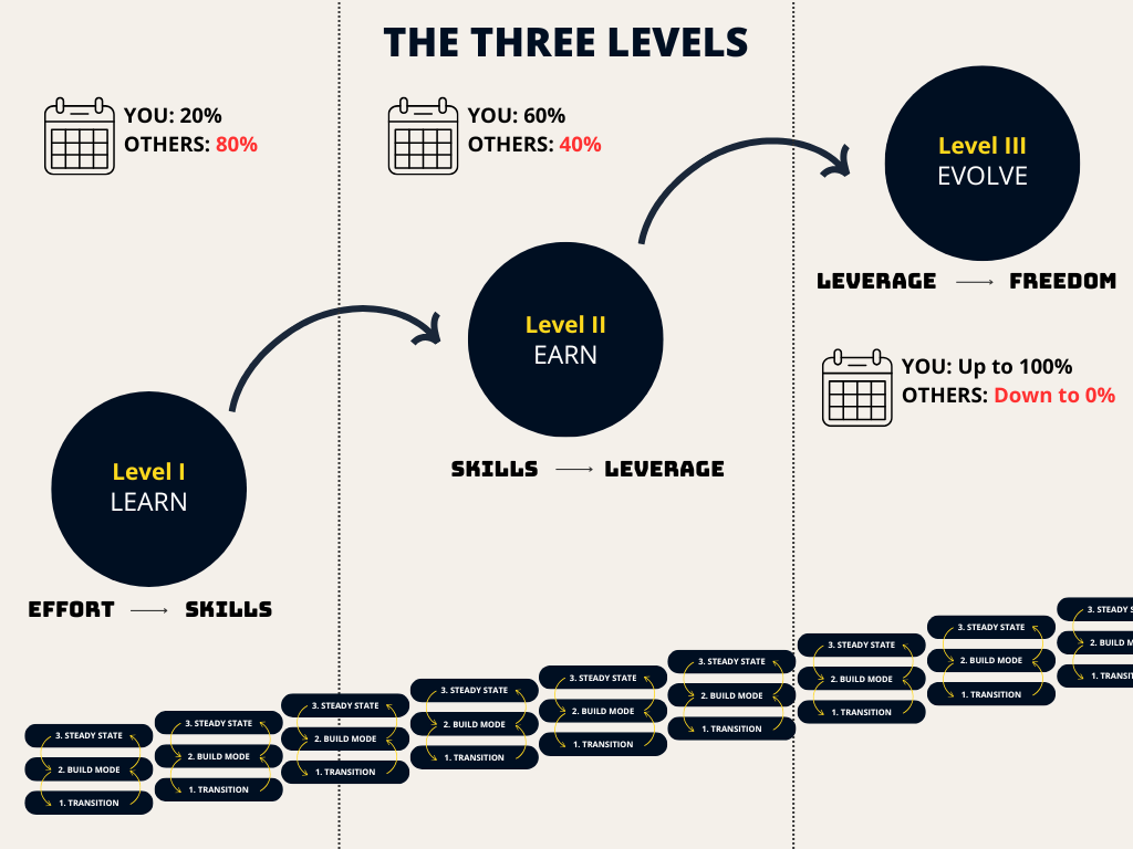 Level II: As you progress and gain more experience, you can turn that experience into more autonomy. The “fight” is to own more of your calendar with the things you want (opportunities that fill you up) vs the things you don’t want (draining events that deliver no value).