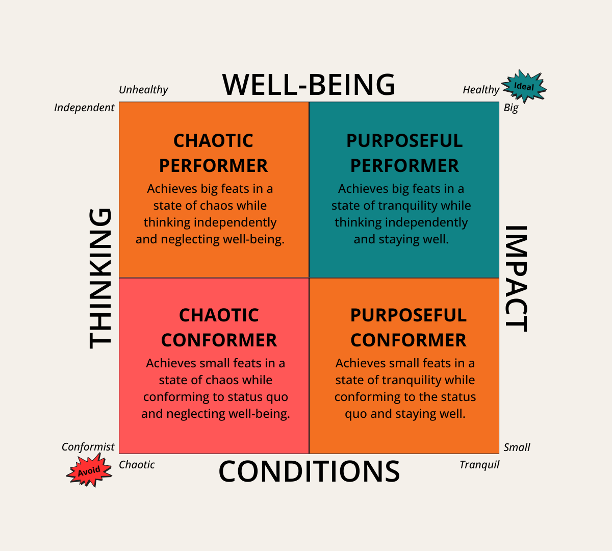 The Chaotic Conformer (avoid this): This performer achieves small feats in a state of chaos while conforming to status quo thinking and neglecting their well-being.
